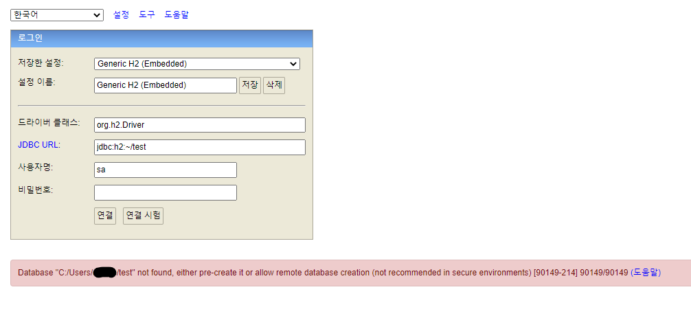 해당 경로에 메모장을 만든 후 파일명을 test.mv.db 로 수정 후 저장하면 해결된다. (test는 커넥션팩토리에서 설정한 스키마명)